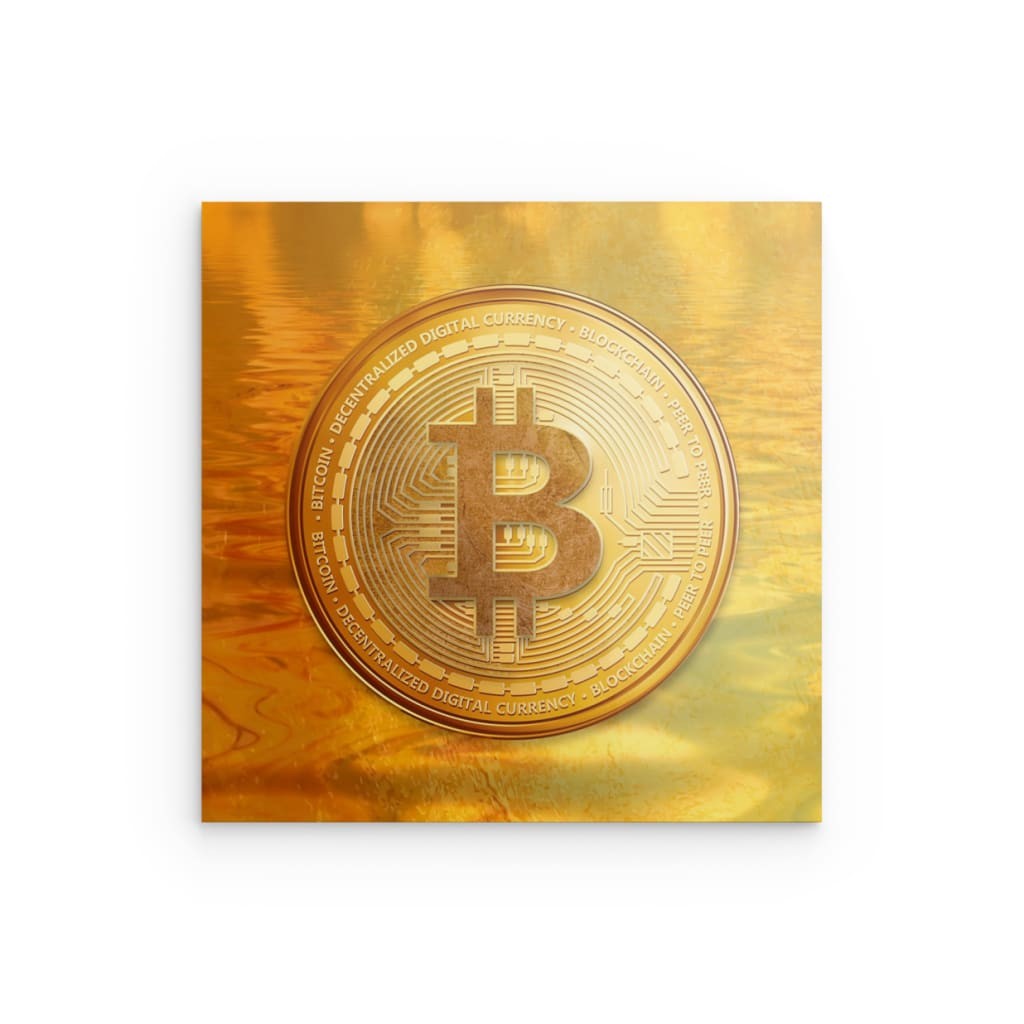 Eine beeindruckende Darstellung einer goldenen Bitcoin-Münze, majestätisch schwebend auf einer Oberfläche aus schimmernden Goldwellen. Die satten, warmen Farbtöne unterstreichen Bitcoins oft als „digitales Gold“ bezeichneten Status – ein wertvolles und stabiles Gut im volatilen Kryptowährungsmarkt. Die komplexen Details der Münze, darunter das ikonische „B“-Logo und die leiterplattenartigen Muster, sind deutlich sichtbar und unterstreichen die Verbindung traditioneller Währungsästhetik mit moderner Digitaltechnologie. Dieses Bild vermittelt eindrucksvoll das Konzept von Bitcoin als wertvolles und liquides Gut. Erhältlich in den Größen: 40 x 40 cm, 60 x 60 cm und 80 x 80 cm.