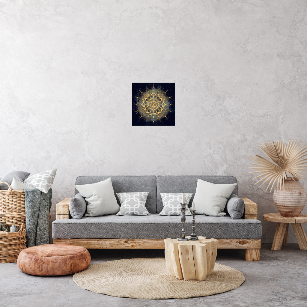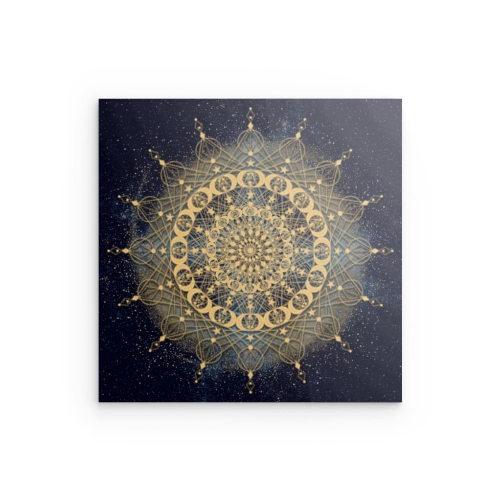Verwandeln Sie Ihren Raum mit diesem atemberaubenden Goldenen Portal Fraktal-Mandala Metallwandbild. Ihr einzigartiges Design, ein filigranes goldenes Mandala mit Mustern heiliger Geometrie vor einem tiefblauen, sternenklaren, kosmischen Hintergrund, wird leuchtend auf eine elegante Verbundplatte gedruckt. Der leichte schwarze Kunststoffkern wird von zwei hauchdünnen Aluminiumplatten umschlossen. Dieses Stück besticht durch seinen wunderbar kräftigen und dennoch dezenten Look und passt perfekt zu jedem modernen Designkonzept.