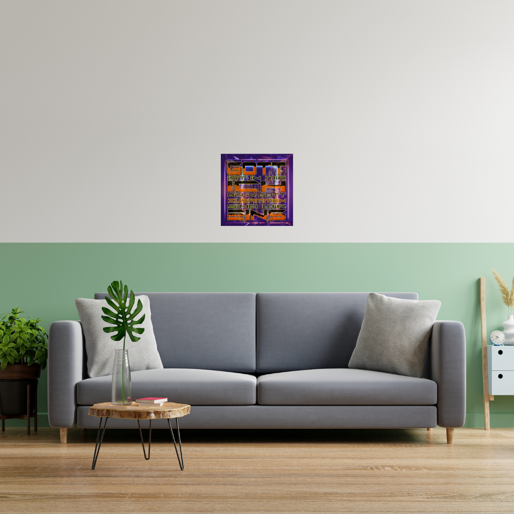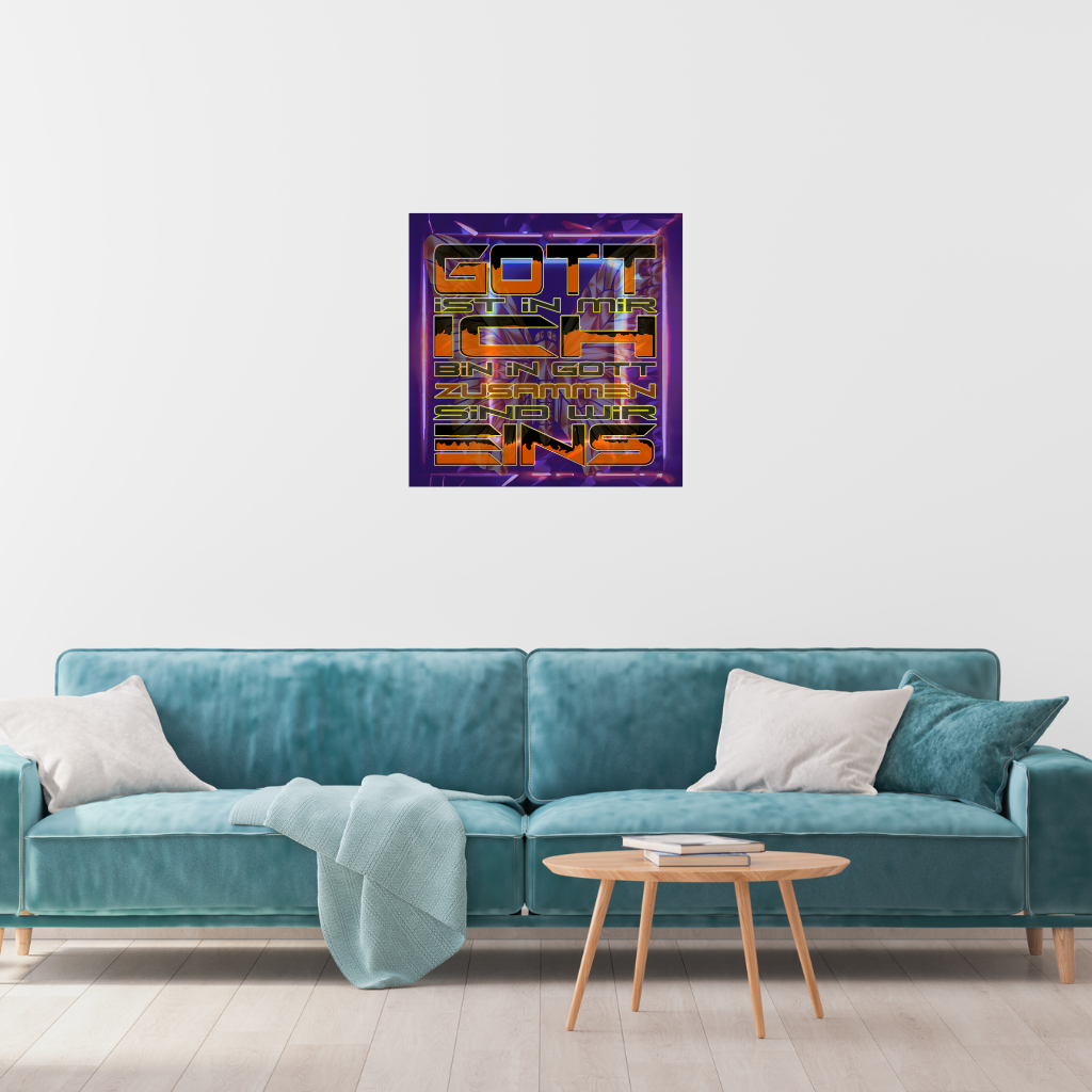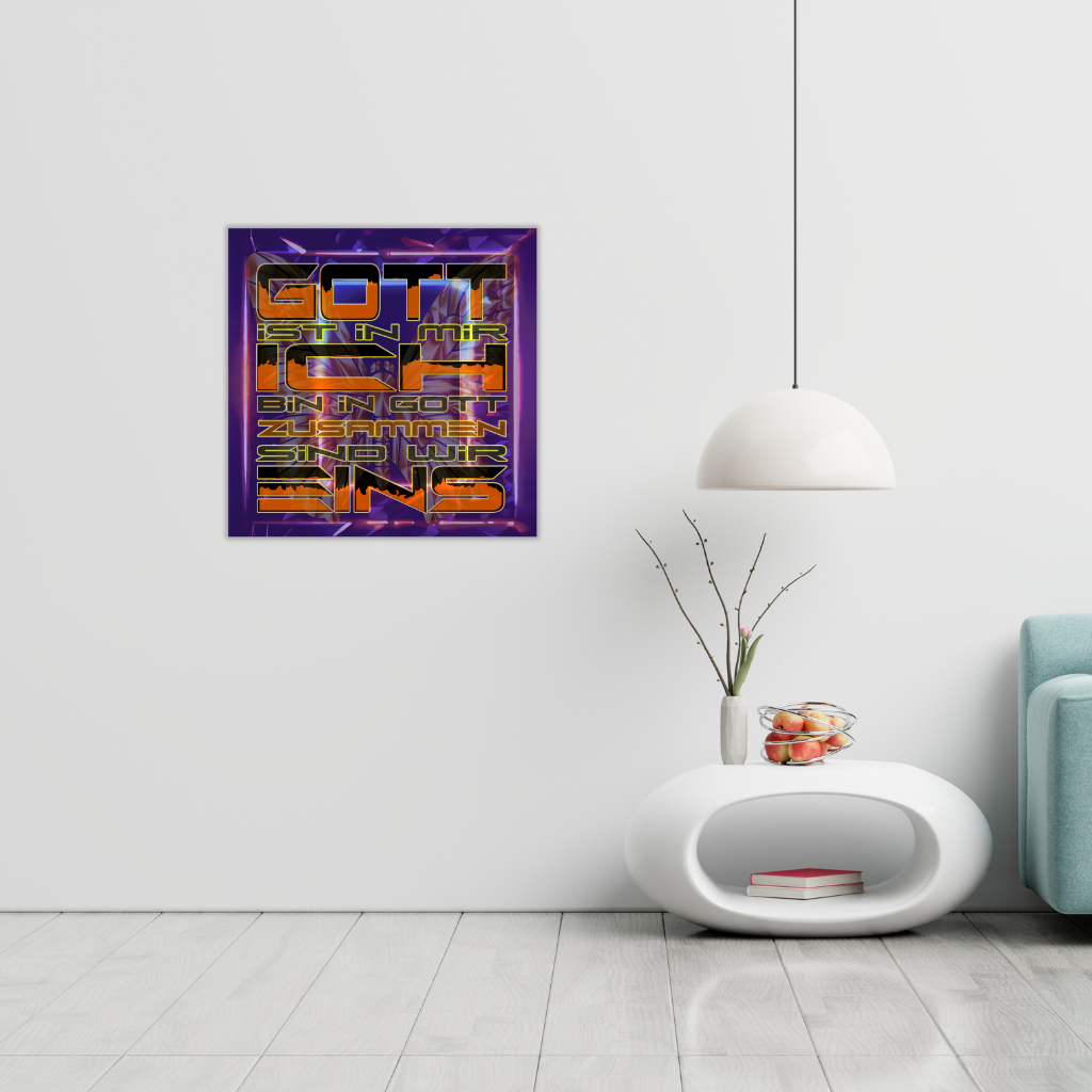 Verwandeln Sie Ihren Raum mit diesem atemberaubenden Metallwandbild „Gott, ich bin eins“, neon-lila. Ihr einzigartiges Design mit dem kräftigen, leuchtenden deutschen Text („GOTT IST IN MIR, ICH BIN IN GOTT, ZUSAMMEN SIND WIR EINS“) auf leuchtend violettem Hintergrund ist auf eine elegante Verbundplatte gedruckt, deren leichter schwarzer Kunststoffkern von zwei hauchdünnen Aluminiumblechen umhüllt ist. Dieses Stück bietet einen wunderbar kräftigen und dennoch dezenten Look und passt perfekt zu jedem modernen Designkonzept.