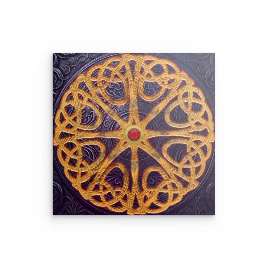 Discover ancient symbolism with the Celtic Wheel Ruby metal wall art. This stunning piece features a golden Celtic wheel or rosette with an intricate knot pattern on a rich, dark purple textured background. A vibrant ruby-red gemstone at the center creates a striking focal point, symbolizing tradition and connection. Printed on an elegant composite board, this premium piece offers a contemporary print. Its lightweight core and contemporary borderless design make it ideal for any contemporary setting. Available in sizes 40 x 40 cm, 60 x 60 cm, or 80 x 80 cm.