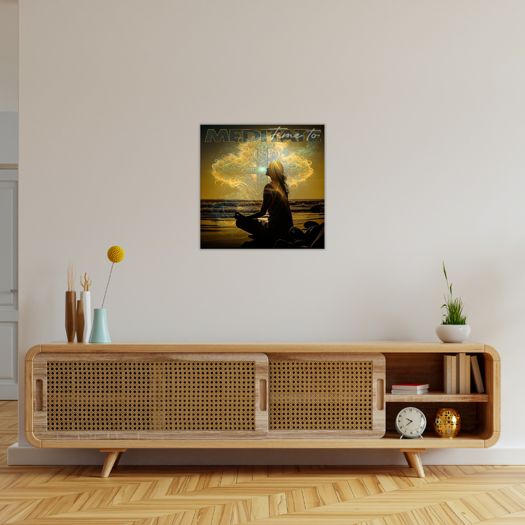 Verwandeln Sie Ihren Raum mit diesem atemberaubenden Metallwandbild „Time to Meditate – Sonnenuntergang am Meer“. Ihr einzigartiges Design zeigt eine meditierende Silhouette am Strand bei Sonnenuntergang, den Text „Time to Meditate“ und ein strahlendes spirituelles Kreuz. Es ist leuchtend auf eine elegante Verbundplatte gedruckt, deren leichter schwarzer Kunststoffkern von zwei hauchdünnen Aluminiumblechen umhüllt ist. Dieses Stück bietet einen wunderbar kräftigen und dennoch dezenten Look und passt perfekt zu jedem modernen Designkonzept.