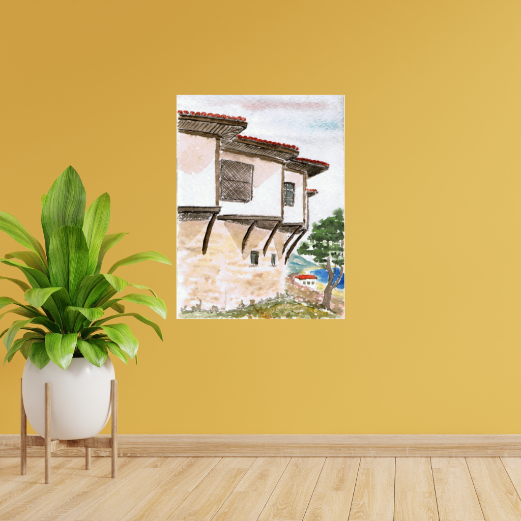 Be the first to review “Produkttitel: Metallwandbild „Traditionelles mazedonisches Haus“ – Aquarell-Landschaftsdruck”