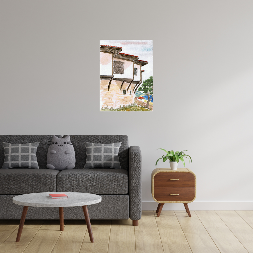 Experience the charm of traditional Macedonian architecture with this exquisite metal wall mural. This watercolor print depicts a classic Macedonian house with its distinctive overhanging upper stories and red tiled roof, nestled in a tranquil landscape overlooking the sea. The soft colors and rustic details convey a sense of peaceful, timeless beauty.
