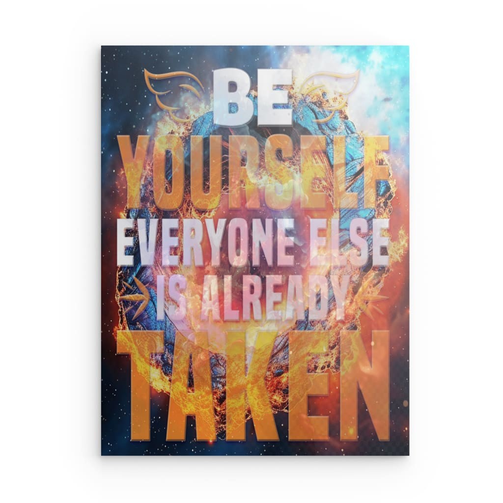 This vibrant and powerful “Be Yourself” image emphasizes individuality with the compelling phrase, “BE YOURSELF, ALL OTHERS ARE ALREADY TAKEN.” The words are written in bold, textured fonts that appear to burst from a background of swirling cosmic colors reminiscent of galaxies and nebulae, suggesting the infinite possibilities and unique brilliance of each individual. Subtle angel wings flank the word “BE,” adding a touch of ethereal grace and protection to the message of authenticity. This work is perfect for those seeking to embrace their true self, celebrate their uniqueness, and build self-confidence. Available in sizes 30 x 40 cm, 60 x 80 cm, and 75 x 100 cm, it makes an uplifting addition to any space where self-expression is valued.